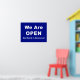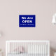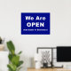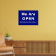 A simple yet bold blue poster that is suitable for business purposes that states, “WE ARE OPEN and back in business” to be displayed for a business, organization or group that has been temporarily closed. A great way to let everyone know that you are open and back in business. Displaying it in your store window is an option.
