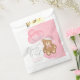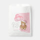 Celebrate the coming of your bundle of joy with these adorable we can barely wait snowy pink winter Christmas baby shower favour bags featuring a sleepy bear wearing a baby pink santa hat and bow holding balloons sitting on a sparkly cloud.