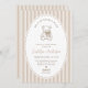 This charming neutral teddy bear baby shower invitation features a soft striped background, an elegant oval arch frame, and a hand-drawn teddy bear illustration.