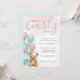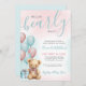 “We can BEARly wait” sets the tone for this adorable baby shower invitation, updated with a soft mix of pink and blue for a surprise gender or gender neutral celebration. The design features watercolor balloons in pink and blue tones, a cute tan teddy bear with a simple bow, and a coordinating gift box, all set against a light, airy background for a sweet and modern feel.
