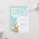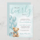 The back features a matching teal blue background for a clean, cohesive finish. Perfect for year-round baby showers, this sweet and versatile invitation is available as a printed card or a digital file for easy sharing or local printing.