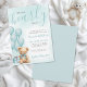 “We can BEARly wait” sets the tone for this adorable baby shower invitation, updated with a teal blue color palette for a baby boy or a gender neutral celebration. The design features teal watercolor balloons, a cute tan teddy bear with a simple bow, and a coordinating gift box, all set against a soft teal blue background for a fresh, modern feel.