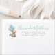 This adorable return address label features a cute tan teddy bear with a teal blue bow, holding teal watercolor balloons, placed on the left side. The right side displays your name in a soft, elegant blue script with the address in a classic grey serif font. The charming design, complete with a teal gift box, is perfect for a baby boy’s baby shower. The mix of playful and elegant fonts adds a sweet touch, and you can customise the colours and background to match your theme.