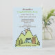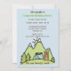 Super cute camp out birthday party design features a graphic of a tent with party bunting hanging on it. The tent is in front of mountains and within the trees. Standing next to the camping tent is a cute little brown bear. There is customisable text in brown and green font where you can add the birthday boy's name and all of the birthday camping party information. Below the tent and bear graphic is text in brown font that says "We can "bearly" wait!" The background of the invitation is a pale blue colour. The reverse side of the invitation has the same blue background and is covered in a pattern of the camping tent graphic. This is an adorable camping birthday theme invitation. Matching paper plates, napkins and postage also available. Also available for girls in pink!