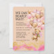 Invite loved ones to celebrate your growing family with this adorable “We Can Bearly Wait” baby shower invitation! Featuring a charming hand-painted teddy bear surrounded by elegant tones of blush pink and gold abstract accents, and festive golden brown and pastel pink balloons, this design is perfect for a classy yet playful celebration.