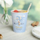 Baby Shower Vessel Design with Beautiful Bear Theme in watercolor flying in a basket with blue and white balloons and the phrase "WE CAN BEARLY WAIT" with cute black typography and a blue background with white clouds around!.. It can be customized with your baby's name.