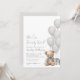 On the right, a charming watercolor illustration features a tan teddy bear with grey balloons, a coordinating grey bow, and a matching gift box. The bear has a subtle grey filter applied, which enhances the neutral look. If you prefer a more vibrant version of the bear, you can easily remove the filter in the editor: click on the artwork 'group,' select the bear, and at the top right, change the 'filter' setting to 'none.'