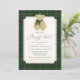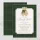 Invite loved ones to celebrate with this classic “We Can Bearly Wait” baby shower invitation featuring a hand-painted watercolor teddy bear wearing a green scarf. The phrase “We Can Bearly Wait” is displayed in elegant dark green calligraphy with matching serif lettering. Your baby shower details appear below, framed within a vintage-style cream border surrounded by a watercolor green plaid background. With its timeless preppy design and cozy charm, this invitation is perfect for fall and winter boy baby showers.