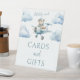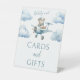 Introduce whimsical charm to your "We can bearly wait" themed baby boy shower with this delightful cards and gifts sign. Featuring a light blue watercolor teddy bear soaring on a plane, this sign adds a touch of sweetness to your celebration. Explore this adorable design for a memorable and joy-filled baby shower experience.