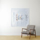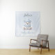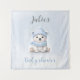 Adorable backdrop tapestry for winter boy baby shower in soft blue, white and grey featuring the cutest happy baby polar bear in a blue hat and scarf. Easily personalise the text. - Kate Eden Art