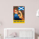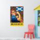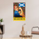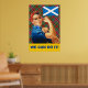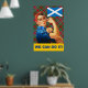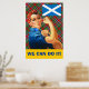 A humourous poster for supporters of independence for Scotland from the UK Westminster Government. The vintage illustration shows retro housewife Rosie in blue work shirt with sleeves rolled up and flexing her muscles. She wears a Forties style red and yellow polka dot scarf and a Yes badge on her shirt collar. The slogan reads We Can Do It! in blue lettering on a yellow border. Above the strong woman is a graphic of the Scottish flag. The background is a red, yellow, blue and green tartan plaid pattern.