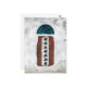 An abstract depiction features a central rusty brown column with a semicircular blue shape at the top and six symmetrical black and white designs aligned vertically. The background has a textured appearance with various shades of white and grey, suggesting a weathered surface.