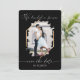 This elegant and simple photo wedding engagement save the date is perfect for any modern couple. It features a black brushstroke halo vignette on top of a photo of the couple outlined in a faux printed gold foil diamond border with white handwritten signature script typography. It's minimal, chic, pretty, and beautiful to announce your special day. On the back features a simplistic text setup with the phrase, "The future Mr. and Mrs."