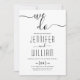 "We do" cursive script handwritten style calligraphy black and white wedding invitation. The back includes a black and white geometric pattern.