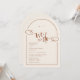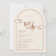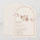 An elegant and modern earthy neutral arch-shaped wedding invitation that features minimalist text with a handwritten script accent in the phrase "we do" with a simple heart doodle. Shown on a neutral beige background with terracotta text and design elements but all elements can be re-coloured to match your theme. © Kimbellished, LLC