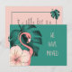 A pretty flamingo wearing a tropical hibiscus is displayed against a teal monstera leaf on a blue-green background. The pink text on front of our change of address announcement card says: "We have moved" and these words can be changed to your own on the template, along with the new address info on back of the card.