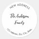 We have moved, return address sticker. Personalise and add your family name, your new address. Curved text. White background, black text.