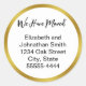 This moving announcement says "We Have Moved" in a cursive, scribble-style script. We Have Moved is on the top line. The other lines are not in script and are for your name(s) and new address. The sticker is white with black text. The faux gold border is not made of foil.