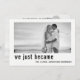 This simple yet elegant simple minimalist modern just married wedding announcement and reception card features your own photo with a black and white Zazzle filter applied, along with the sentiment "We just became Mr. and Mrs." on the front of the card with hand lettered script typography, as well as your married names. Back of the invitations features the same photo with a transparent overlay and a black and white filter, and your wedding reception information on the back. Easy to customise with your own photo and text.