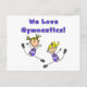Two blonde haired stick figure girl gymnasts in purple leotards and purple text that reads "We Love Gymnastics!" on girl gymnast Tshirts, mugs, bags, cards, stickers, keychains, and more.