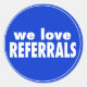We Love Referrals on blue, or change the background colour if you like. Let your business customers know that you appreciate referrals. Staff can wear the button as a reminder, or use the sticker on your products, invoices, or correspondence with clients.