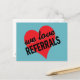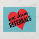 We love referrals design with a red heart on an aqua background is great for realtors or any business to remind your customers to recommend you to their friends and families. Send to your happy clients after a job or service is complete, or just to your friends and associates as a direct marketing reminder.