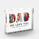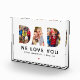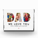 Create a stylish and memorable gift for Dad this Father's Day or any day! This custom tabletop photo block features a collage of three favourite family pictures of the kids designed as a modern and bold sans serif typography design. Personalise the custom text with the names of the children and modify the black text, red heart, and white background if you would like different colours to coordinate with your home decor.