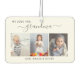 Surprise grandma with this keepsake photo car air freshener. The charcoal gray text reads "We love you grandma," with the word "grandma" in elegant handwriting script with flourishes before and after. Replace the three sample images with your favorite vertical photos of the grandchildren, and add their names below.