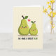 This sweet card features two adorable pear characters sharing a loving moment. At the center are two bright lime-green pears, each topped with a small brown stem and a leafy accent. The larger pear on the left has wide, happy eyes, a big smile, and soft pink blush on its cheeks. Beside it, the smaller pear looks calm and content, with closed eyes, long eyelashes, and the same rosy blush. A small pink heart floats gently between them, symbolizing their close bond. The soft off-white background keeps the focus on the cheerful green and pink colors. Below the pears, bold dark lettering reads “WE MAKE A GREAT PEAR,” with the word “PEAR” highlighted in matching green. With its fun pun and warm design, this image is perfect for sharing Valentine’s Day love ❤️💌🍫.