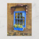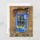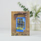 Customise this postcard. A bright cobalt blue, french style window on an adobe and rock wall. Santa Fe, New Mexico. Photography by Minerva Bloom.