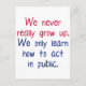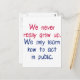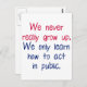 You may act mature in public, but that doesn't mean you've grown up! Tell everyone you're still young at heart with this: "We never really grow up. We only learn how to act in public."