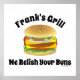 This fun poster features an illustration of a juicy burger and reads "(Your Name)'s Grill" "We Relish Your Buns". It's customisable so you can personalise it by adding your name. (You can make other changes too, if you like).