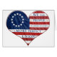 Colourful red, white and blue original 13 state Betsy Ross American flag in the shape of a heart, with the first line from the Preamble of the United States of America Constitution.