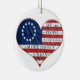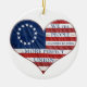 Colourful red, white and blue original 13 state Betsy Ross American flag in the shape of a heart, with the first line from the Preamble of the United States of America Constitution.