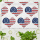 Colourful red, white and blue original 13 state Betsy Ross American flag in the shape of a heart, with the first line from the Preamble of the United States of America Constitution.