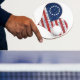 Colourful red, white and blue original 13 state Betsy Ross American flag in the shape of a heart, with the first line from the Preamble of the United States of America Constitution.