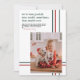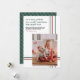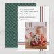 The modern minimalist design is accented by classic holiday colours—deep greens, vibrant reds, and crisp white borders. The layout is clean, featuring a festive, plaid-inspired geometric pattern on the reverse side. This card is designed to showcase your favourite family photo, framed by subtle stripes, adding a contemporary twist to traditional holiday aesthetics.