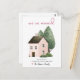 Watercolor illustration of a cute pink house surrounded by trees and plants