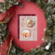 Christmas ornaments, unique round photo holiday greeting cards. Your two favourite photos will hang out on front in holiday 'ornament' baubles on this modern card with real metallic foil accents. A festive wish of a very Merry Christmas runs from the left side finishing in a vertical font on the right side. Your name or family name will appear on the lower back of the card with the current year in the lower left front of this card. A little different from the rest, this quirky layout ensures your greeting card will stand out. Happy holidays!