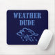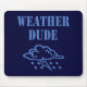 Weather Dude - blue stencil lettering and storm cloud with a dark blue background.