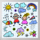 A collection of child-like kids doodles on the theme of weather, sky and seasons.