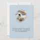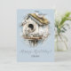 This image portrays a serene springtime scene centered around a rustic wooden birdhouse. The birdhouse is weathered and moss-covered, adding to its charming, natural aesthetic. Perched on its roof is a small bird with soft blue and white plumage, appearing calm and content. Surrounding the birdhouse are delicate white blossoms on slender branches, suggesting the freshness of early spring. The background is softly blurred in hues of blue and white, enhancing the peaceful and dreamy atmosphere. The overall composition evokes tranquility, renewal, and the quiet beauty of nature. Personalize with name and message.
