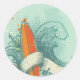 Graphic illustration of a surfboard and ocean waves with weathered looking design