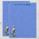 A painted, carved wooden duck with her duckling, heavily weathered, on a blue background. Customise by adding your own text.