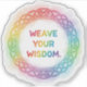This design features the phrase "WEAVE YOUR WISDOM." prominently centered within a beautiful, circular wreath of braided material (like colorful thread or strands).