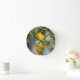 Wall clock with funny image of a yellow weaver bird building a nest.