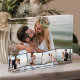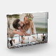 Create your own unique wedding photo block. The photo template is set up ready for you to add 5 of your favourite pictures which will automatically display as one main background photo in landscape format, with the remaining 4 photos overlaid in a zigzag montage. The design has narrow black photo frames.