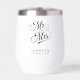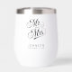 This thermal wine tumbler offers both style and functionality. The cursive Mr. and Mrs., followed by the couple's last name and wedding date, appear in striking gold against a pristine white background. Perfect for toasting the couple during outdoor events or as a keepsake for special moments together.