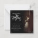Wedding announcement with the image of a dreamy bride leaning against a wall with a bouquet of white flowers in the penumbra - classic style.