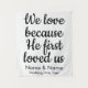 custom wedding backdrop for reception, wedding reception calligraphy back drop, wedding photo booth tapestry backdrop, wedding reception banner, we love because He first loved us, John 4:19, Christian wedding ceremony arch, custom wedding backdrop for ceremony, wedding photobooth rustic wedding decor, engagement party bridal shower banner, wedding head table couple backdrop, personalised names wedding back drop